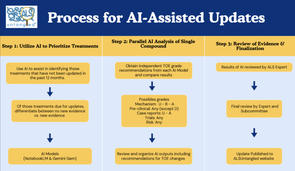 Since 2026, ALSUntangled has begun using artificial intelligence (AI) to help update previously published reviews. The purpose of using AI is to speed up the review process, not to replace expert judgment. AI is used to assist with tasks such as identifying new scientific articles, organizing information, and summarizing large amounts of data. This allows ALS experts to focus more time on carefully reviewing the evidence and discussing its clinical relevance. All conclusions published by ALSUntangled are reviewed and approved by human experts. AI does not make final decisions, assign grades, or provide recommendations on its own. In short, AI helps ALSUntangled work more efficiently, while expert oversight remains central to every review.